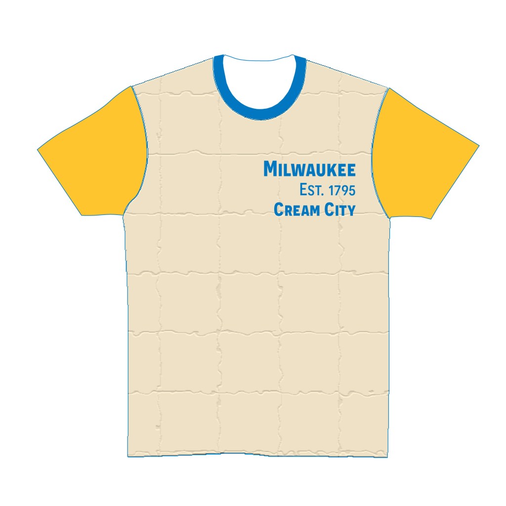 Seen in the middle on top is the shirt design that illustrates the city’s history with water, brewing, and unity. All of this history is captured through the shirt’s colors: blue (representing the city’s relationship with its rivers and Lake Michigan), gold (showcasing the city’s rich history of brewing), and white (symbolizing Milwaukee’s unity and the sun rising over a new day).