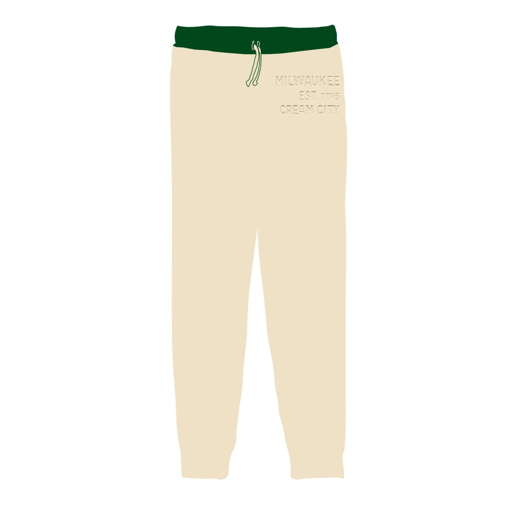 The sweatpants design featured on the top left above takes inspiration from the Milwaukee Bucks of the NBA. Therefore, the colors of green and cream not only resemble the basketball team, but I wanted to take it a step further by making the text look like it was built within the cream color (was going for a brick effect with the text).