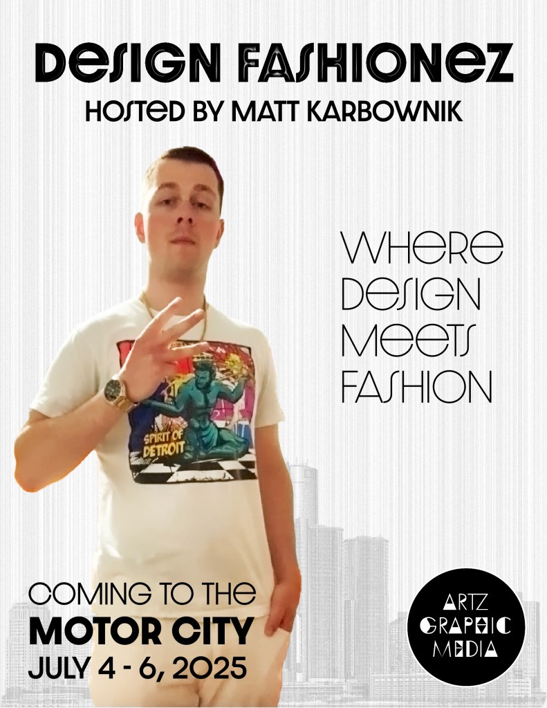 To give my flyer more flair and fine detail, I added a cinematic thin curtain effect in the background to highlight Detroit’s history of design and cultural impact. Upon looking at the flyer, the text and font style at the top, “Design Fashionez,” convey boldness and ambition, while the motto “Where design meets fashion” illustrates precision and craftsmanship. Ultimately, the name (Design Fashionez) behind the concept event promoted in the flyer is meant to symbolize the unity of design and fashion coming together and expressing itself as a combined entity.